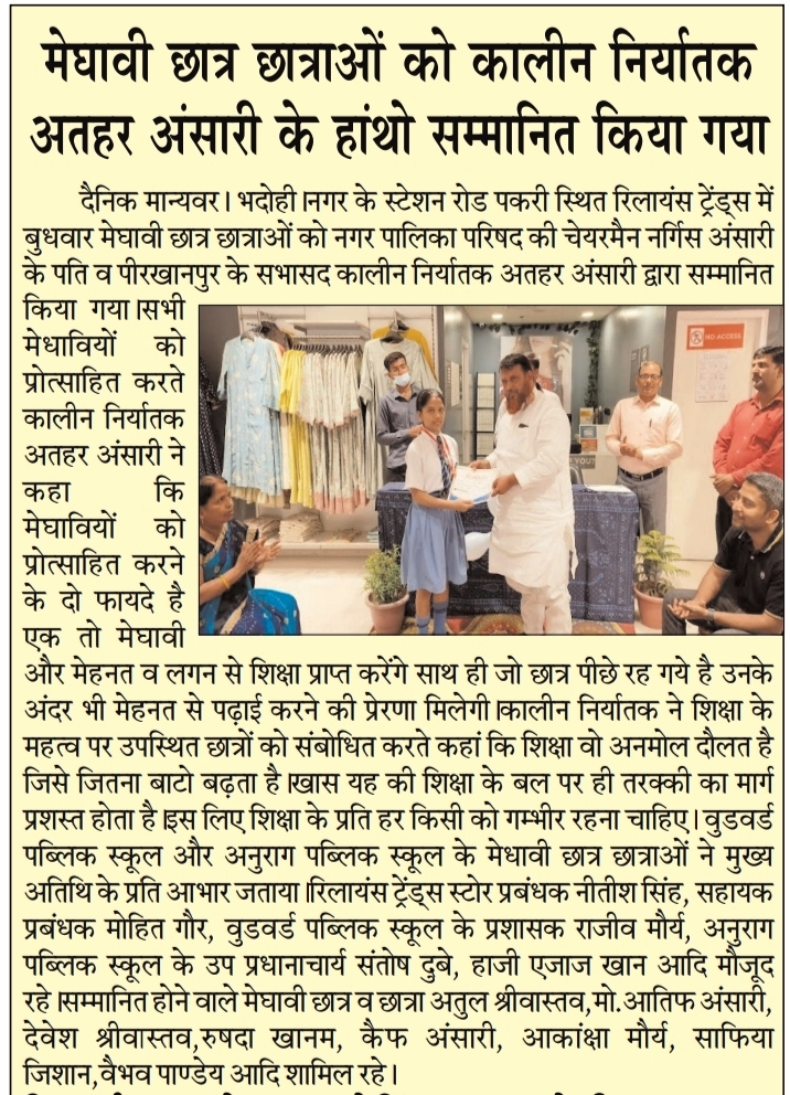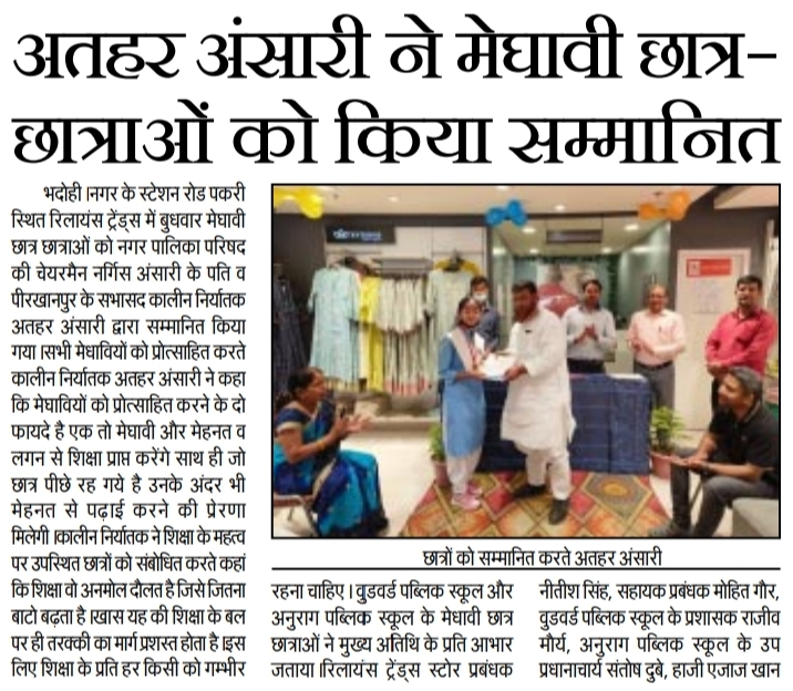 CHAIRMAN OF BHADOHI MR. ATHAR ANSARI FELICITATED THE TOPPERS OF WOODWARD